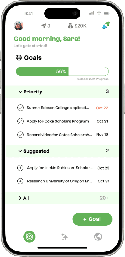 A personalized feed of scholarships, tips, and deadlines tailored to each student’s interests, goals, and status.