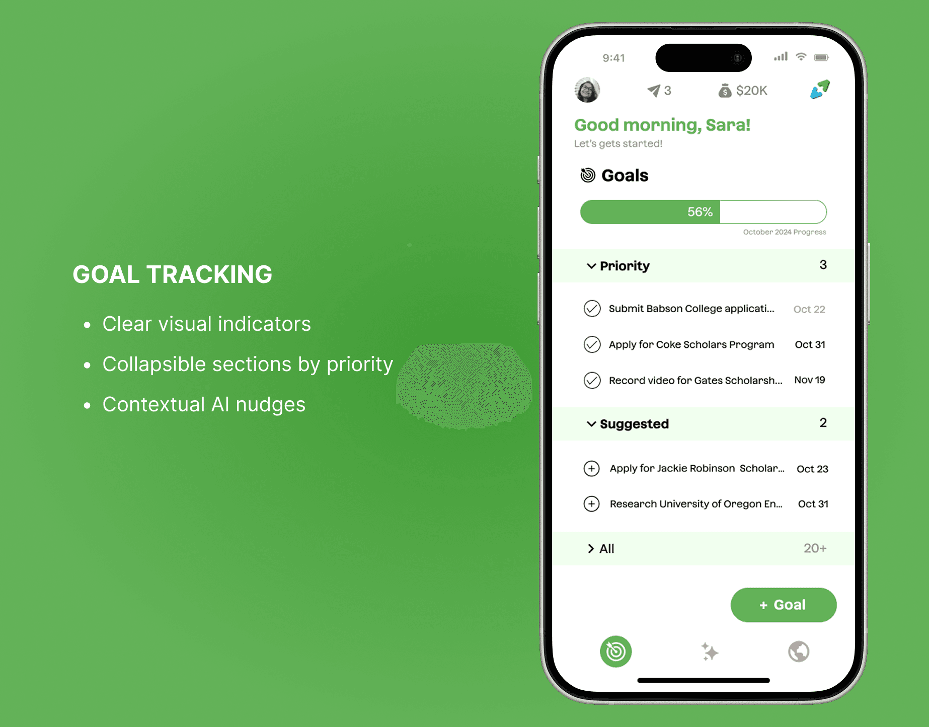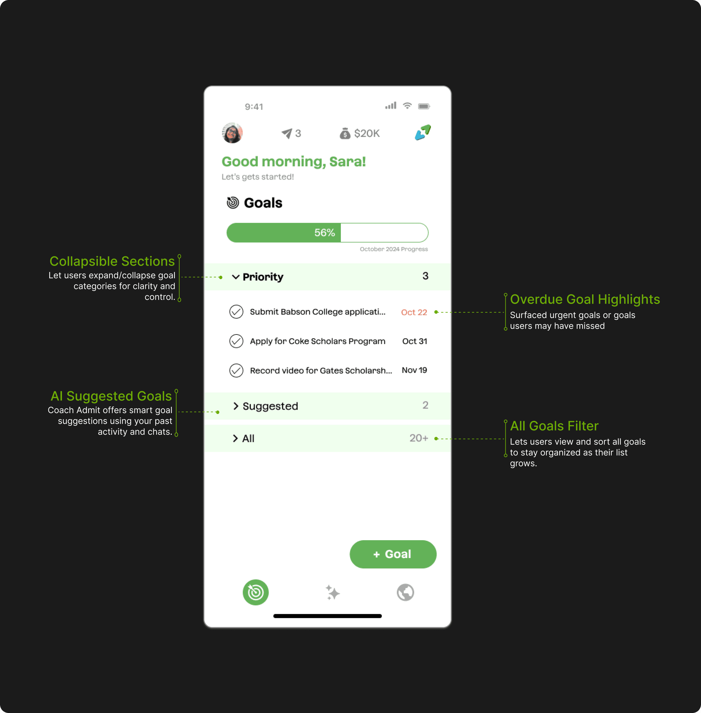 How might we create an intuitive, convenient, and personalized experience for keeping track of goals?
