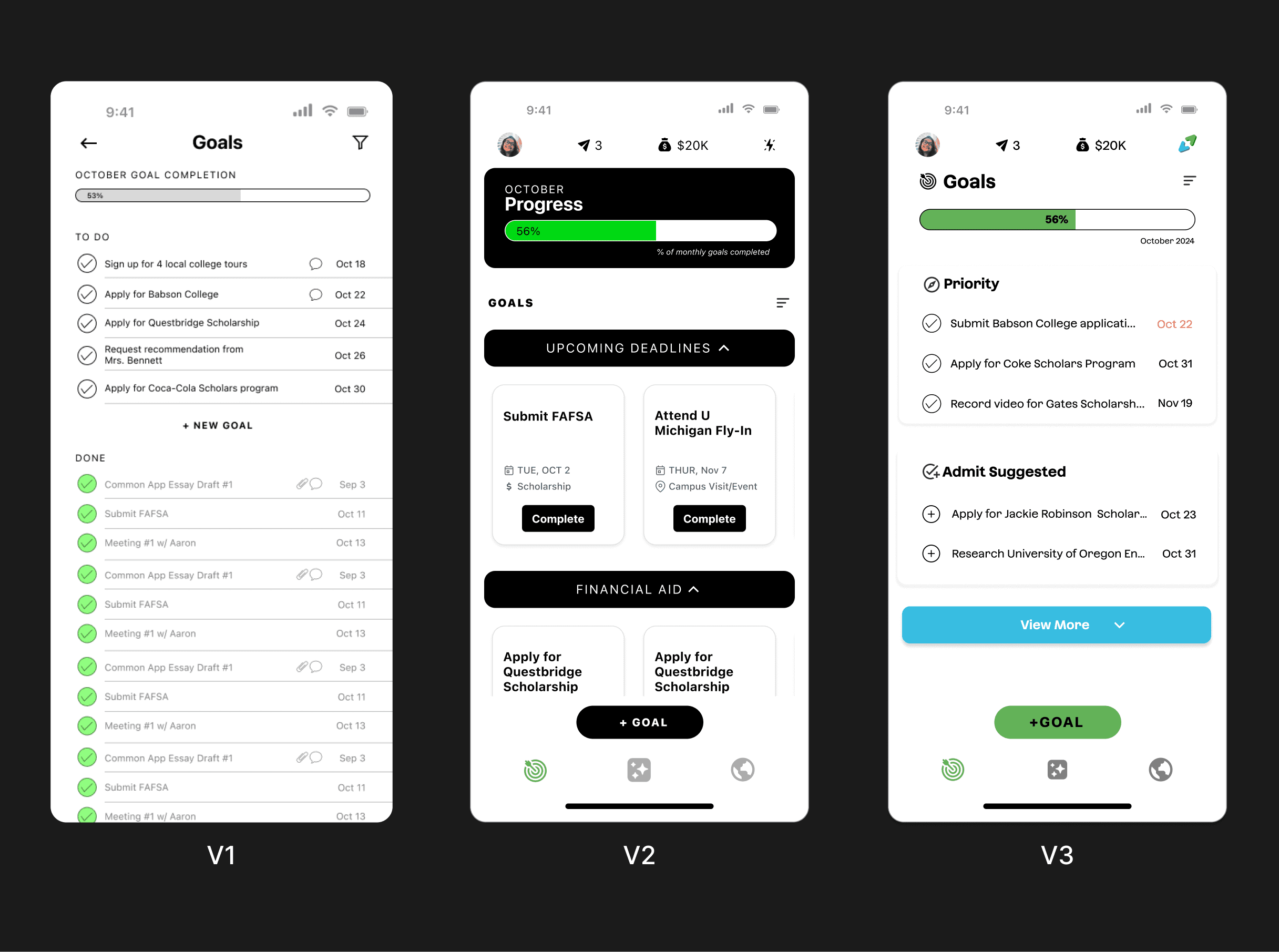 Fast-moving startup timelines, limited engineering bandwidth, and the need to scale to hundreds of students per counselor shaped the scope. I focused the student app on a few core flows—goals, onboarding, and coaching—that I could hand off to the dev team and get them started on developing, rather than trying to solve everything at once.