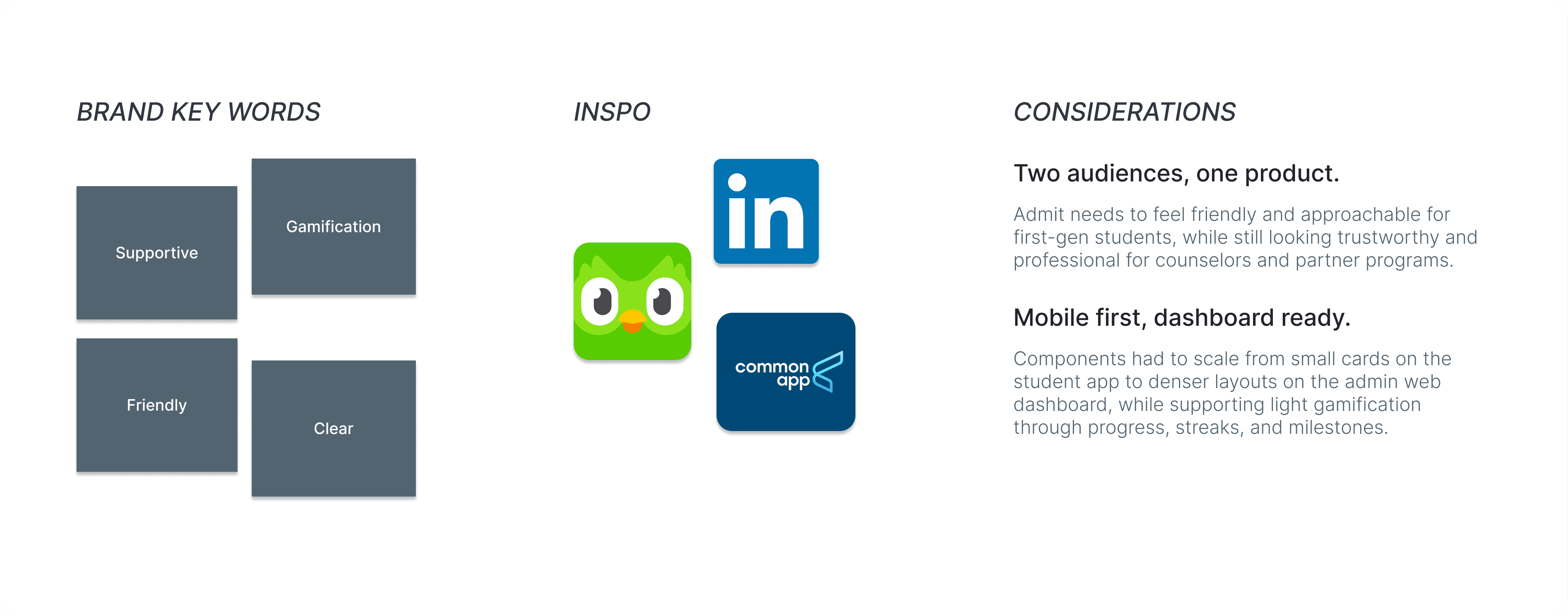 When I joined Admit, there was no existing design system, and it wasn't built for scale. I defined brand keywords and pulled inspiration from Duolingo, LinkedIn, and Common App to balance warmth for students with credibility for partners. This set the tone for the Admit style guide and how the product should feel across mobile and web.