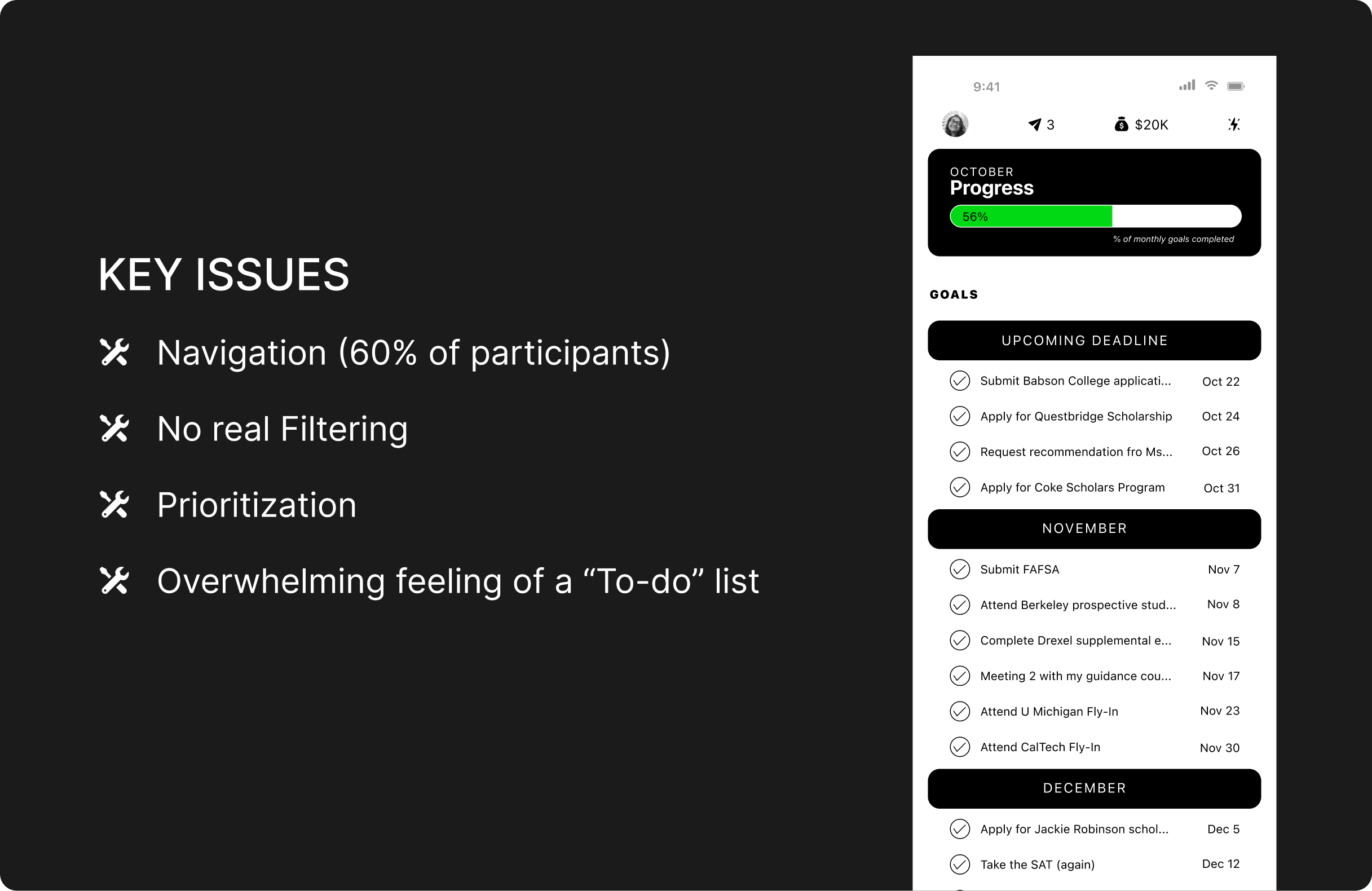 In usability sessions with students and staff, one pattern kept surfacing: the information for goals was helpful, but the experience still felt heavy. Students weren’t always sure what to do first, and administrators worried that students might overlook important tasks buried in lengthy lists.