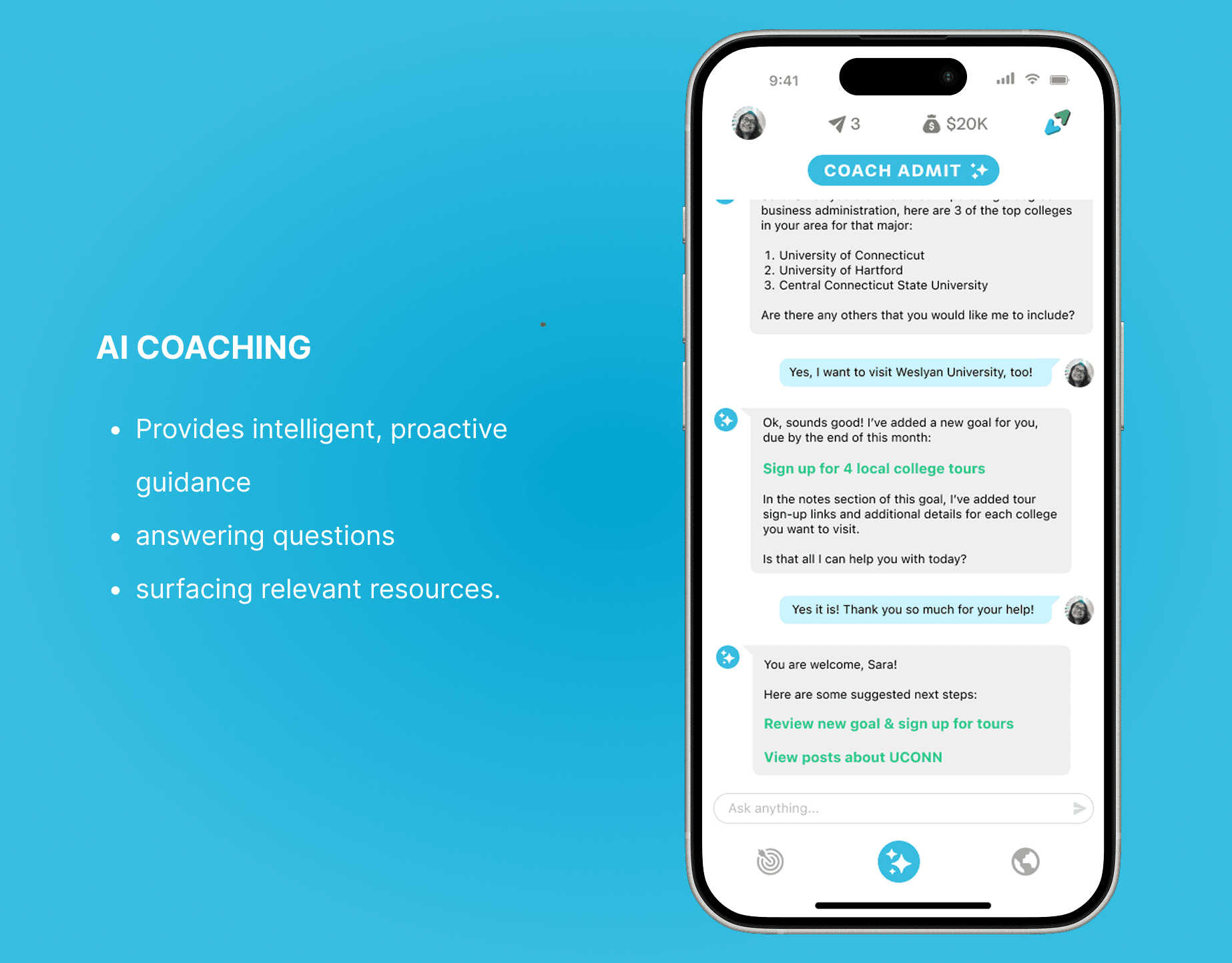 Admit AI closes that gap with a student mobile app built around three core pieces: